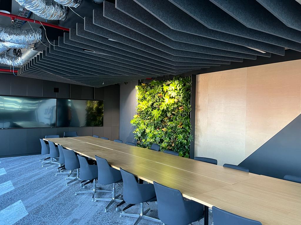 foto: Akustické baffle na stropě, které výrazně zlepšují srozumitelnost řeči v zasedací místnosti.