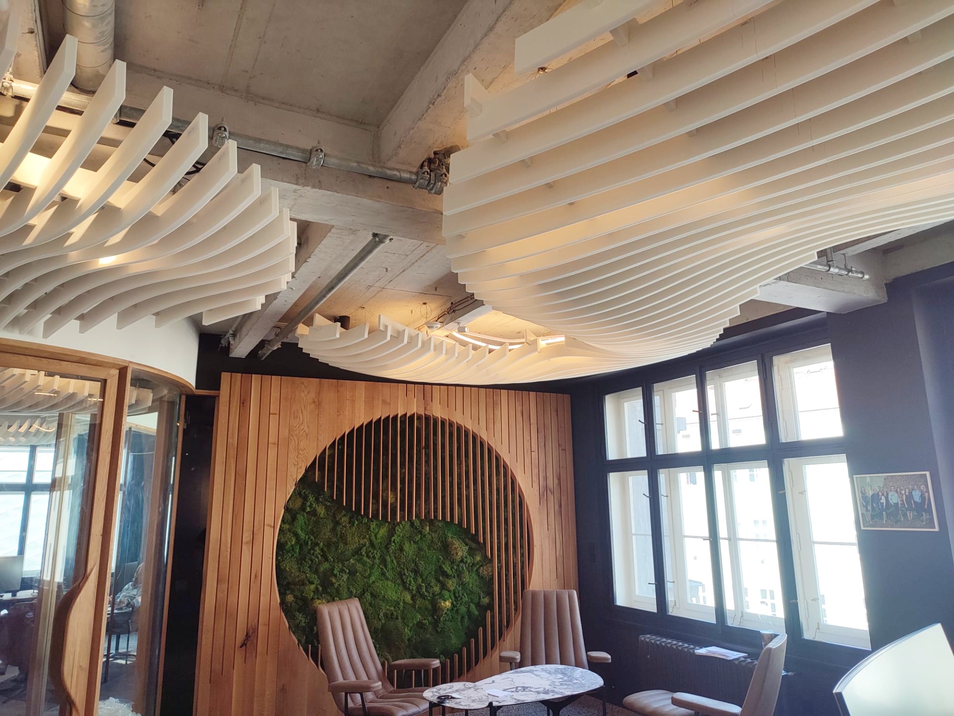 foto: Tvarované stropní lamely, které tlumí odrazy zvuku a dodávají prostoru jedinečný charakter.