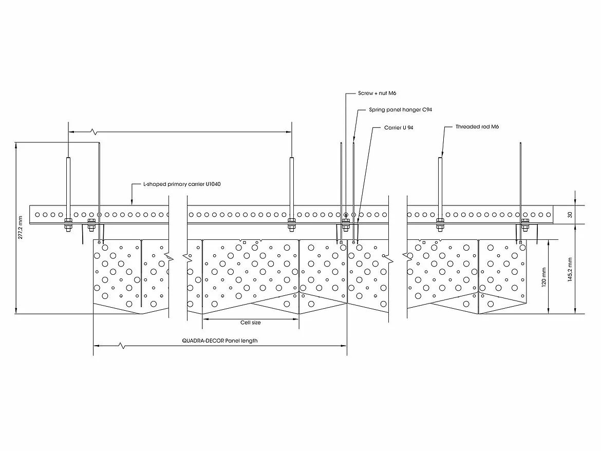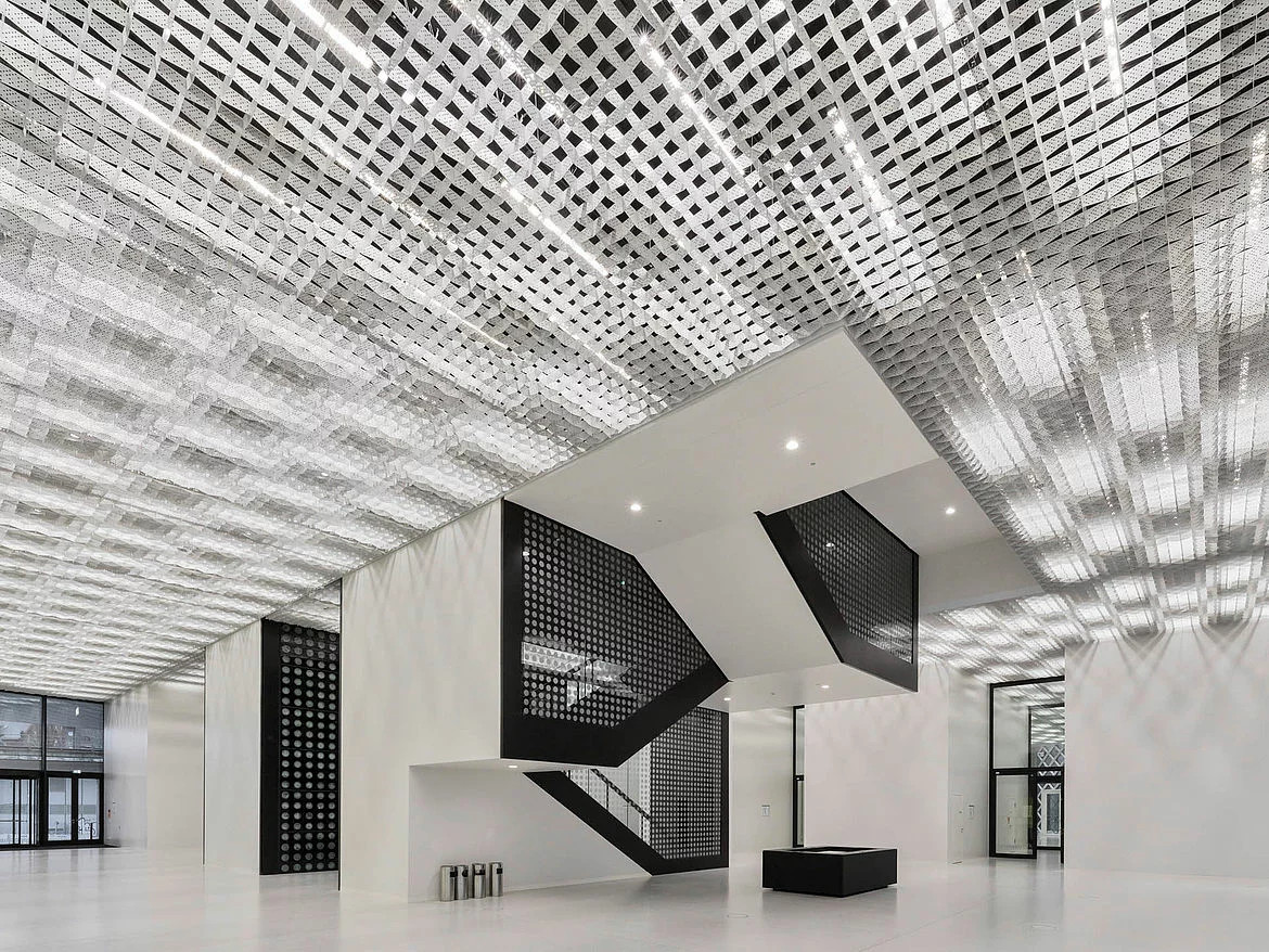 Dizajnový strop QUADRA-DECOR tvoria vlnité lamely usporiadané v posunutom rastri, ktoré dodávajú priestoru ľahkosť a výrazný charakter. Nepravidelné a veľkorysé perforácie napomáhajú rozptylu svetla a prispievajú k vytvoreniu živého stropného vzoru. Tento multidirekcionálny systém je ideálnou voľbou pre moderné a vizuálne dynamické interiéry, kde je cieľom kombinácia designu a funkčnosti.