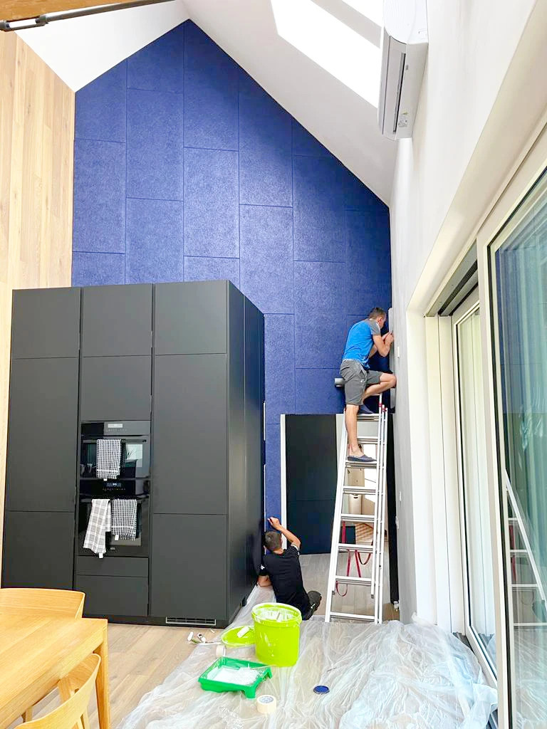 foto: Dokončená inštalácia akustického obkladu. Kombinácia modrého heraklitu s čiernou kuchyňou a prírodnými materiálmi tvorí harmonický celok.