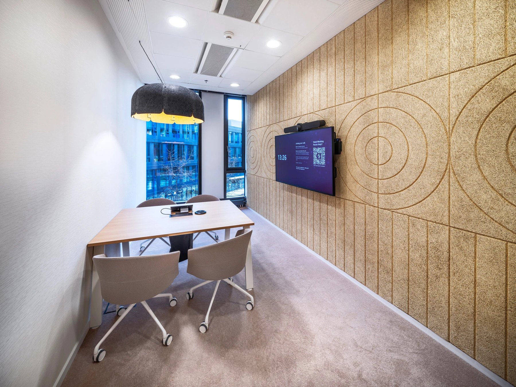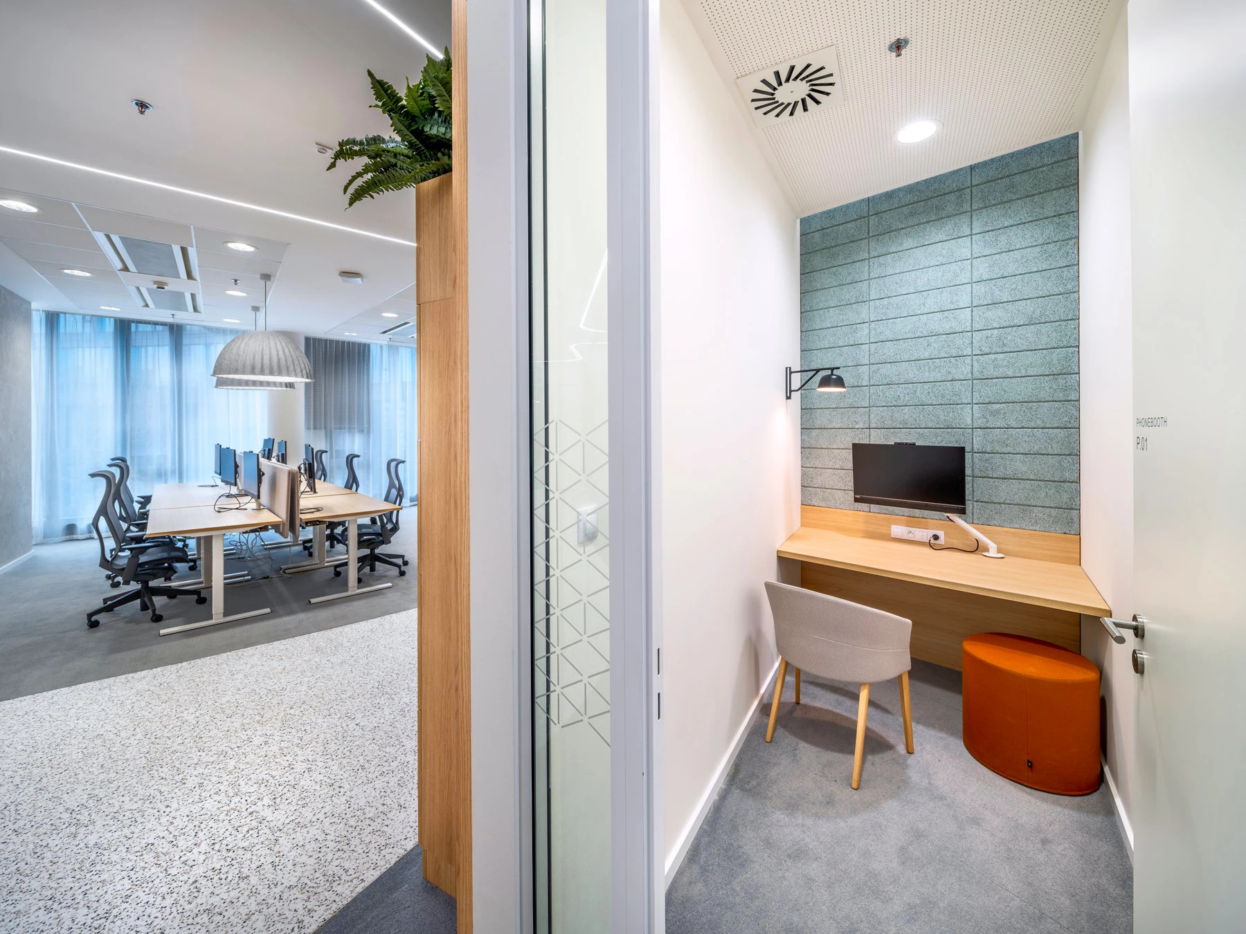 Súčasťou projektu boli aj akustické prvky pre menšie pracovné kúty a telefónne búdky, kde je súkromie a pokoj úplne zásadný. Vďaka inštalácii akustických panelov z recyklovaných PET materiálov sme vytvorili miesta ideálne na krátke videohovory či individuálnu prácu v tichu.