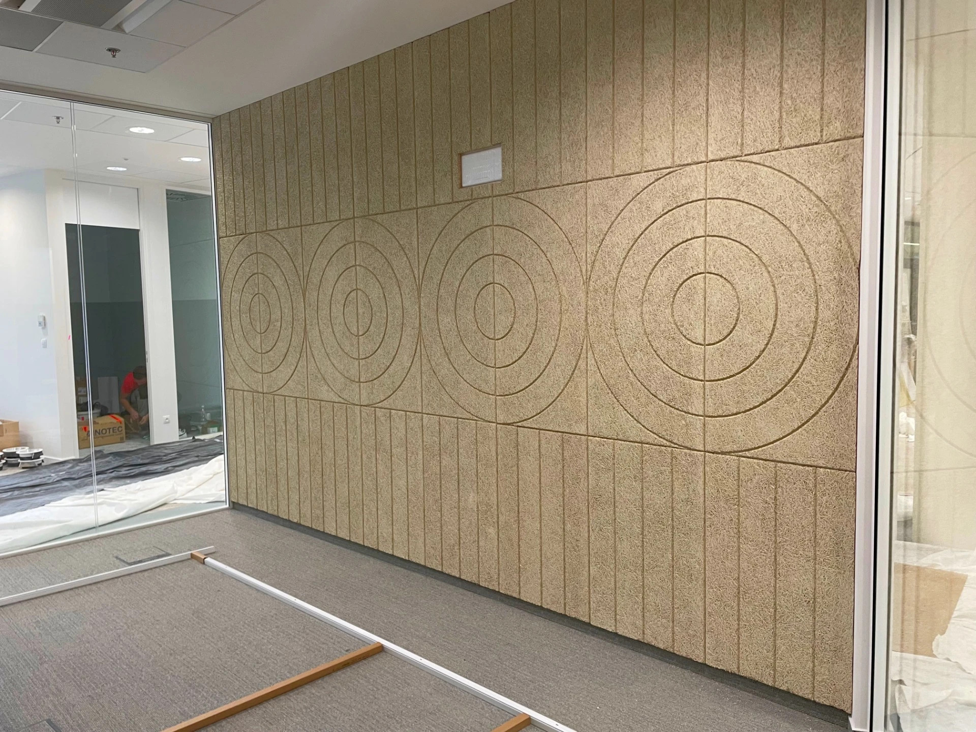V moderných kancelárskych priestoroch sa často stretávame s nadmerným hlukom a ozvenou, ktoré negatívne ovplyvňujú sústredenie aj pohodu zamestnancov. Pre Astra Zeneca sme inštalovali akustické podhľady a stenové obklady z drevovláknitých panelov s dekoratívnymi drážkami a kruhovými frézovanými vzormi. Tie nielen výrazne zlepšujú akustiku, ale zároveň prinášajú vizuálny rytmus do interiéru.
