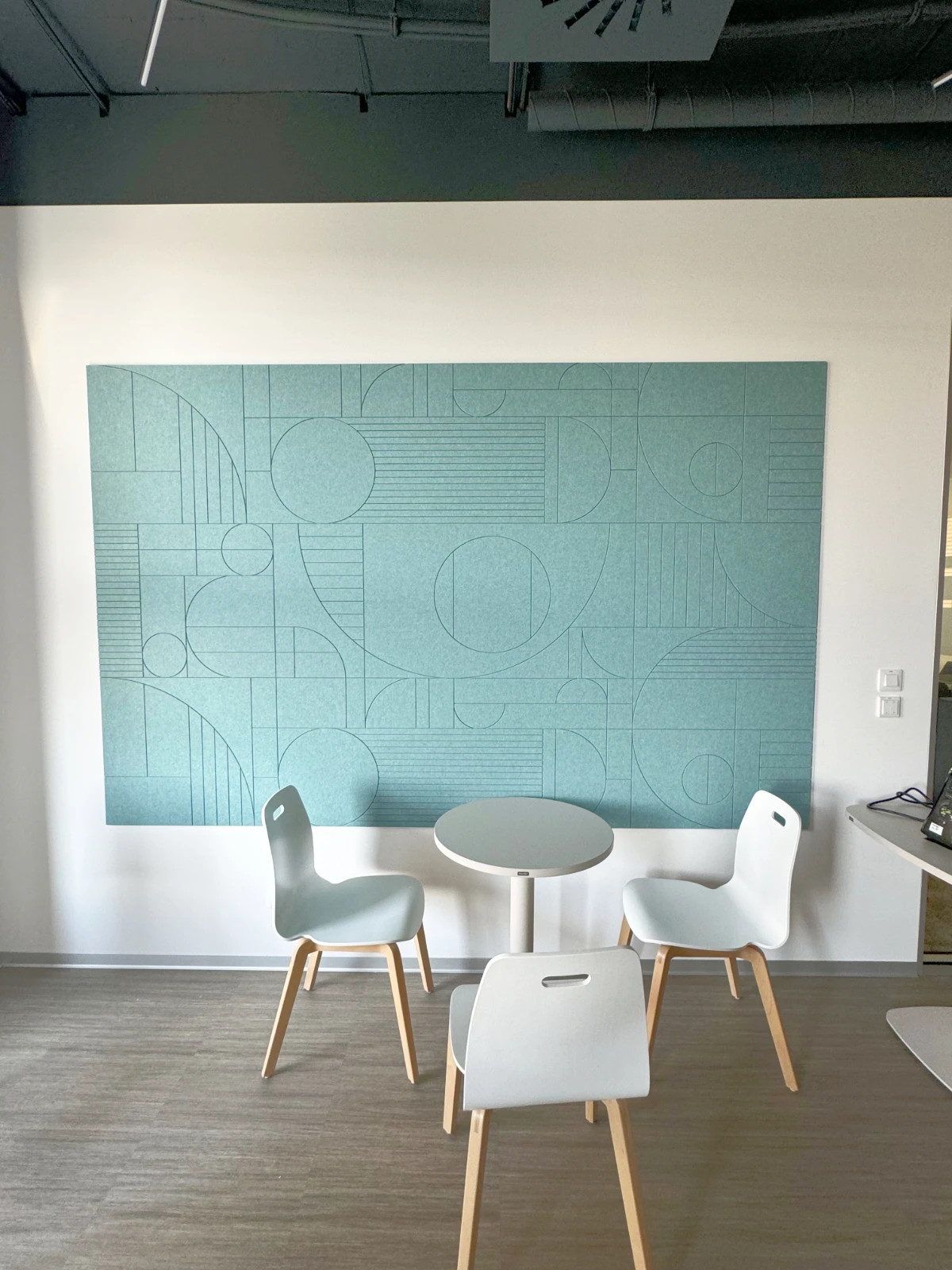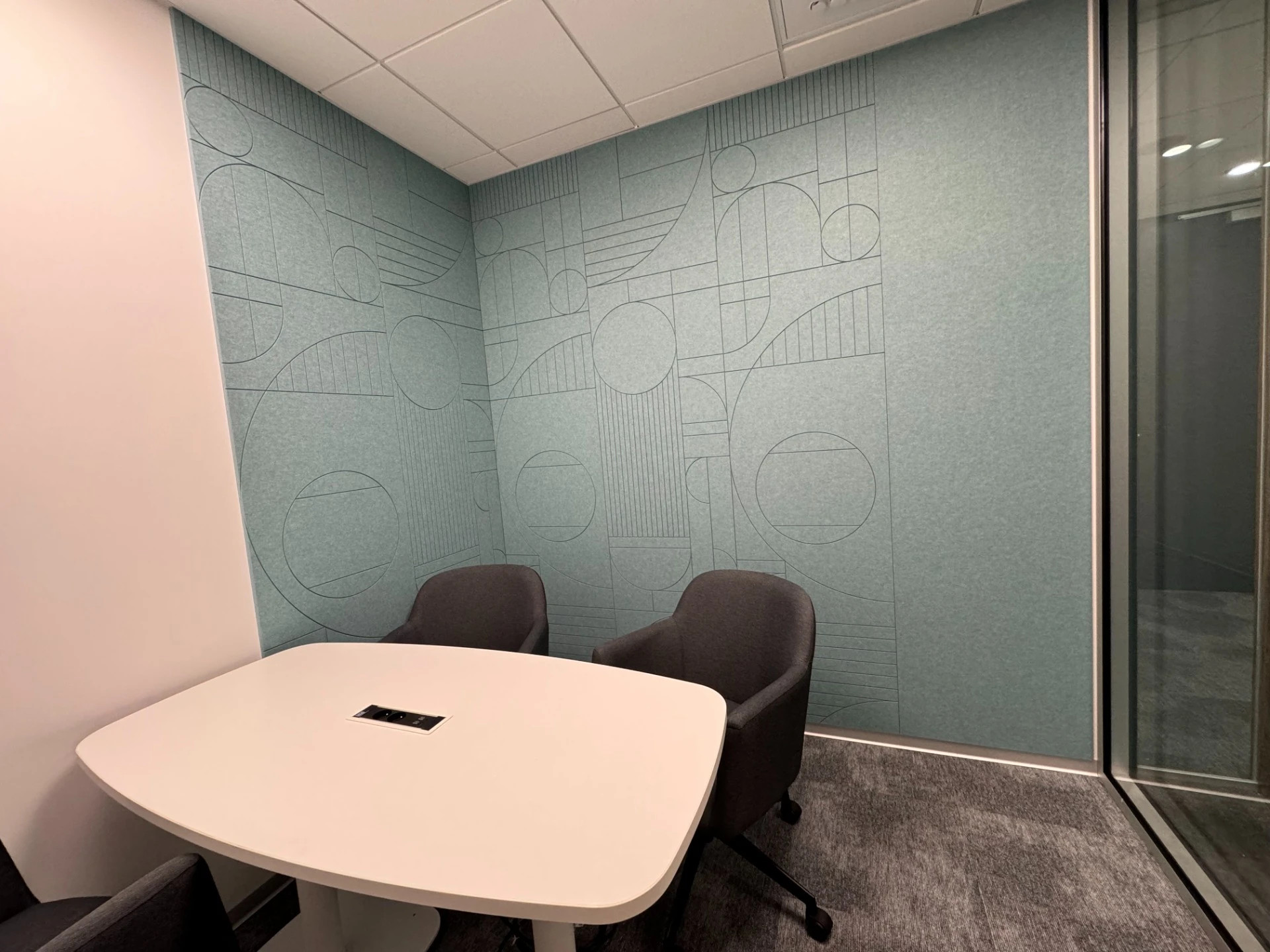 foto: Dizajnový akustický panel v odpočinkovej zóne – funkčný prvok, ktorý pohlcuje hluk a zároveň zdobí priestor originálnym vzorom.