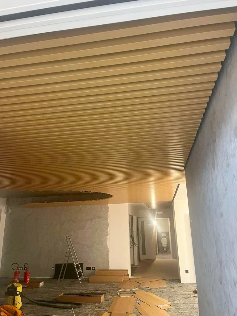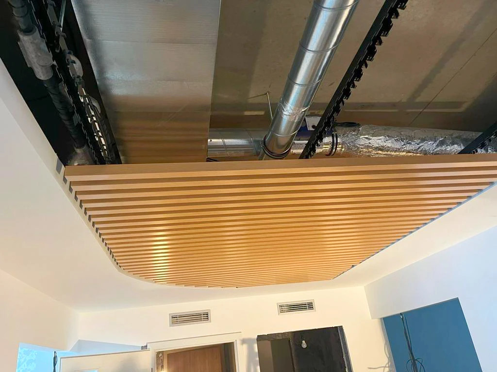 foto: Elegantný vstupný priestor s hliníkovými lamelami v dekore dreva - štýlové a funkčné riešenie stropu.