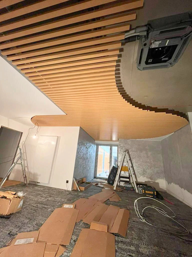 foto: Detail zákazkovo tvarovaných lamiel kopírujúcich nepravidelný pôdorys miestnosti – precízne práce do posledného ohybu.