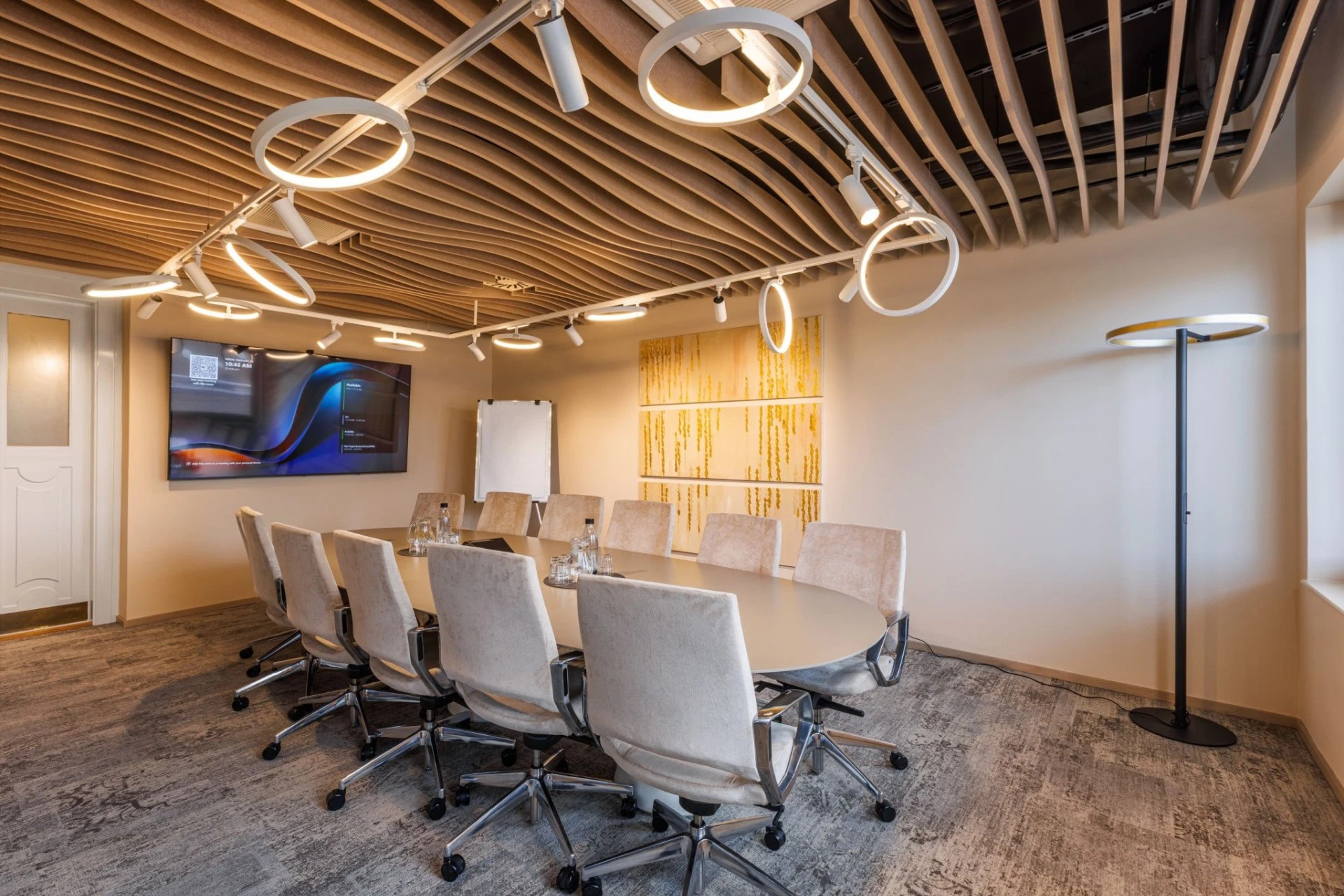 foto: Moris design - Zasadacia miestnosť s lamelovým stropom pre lepšiu akustiku.
