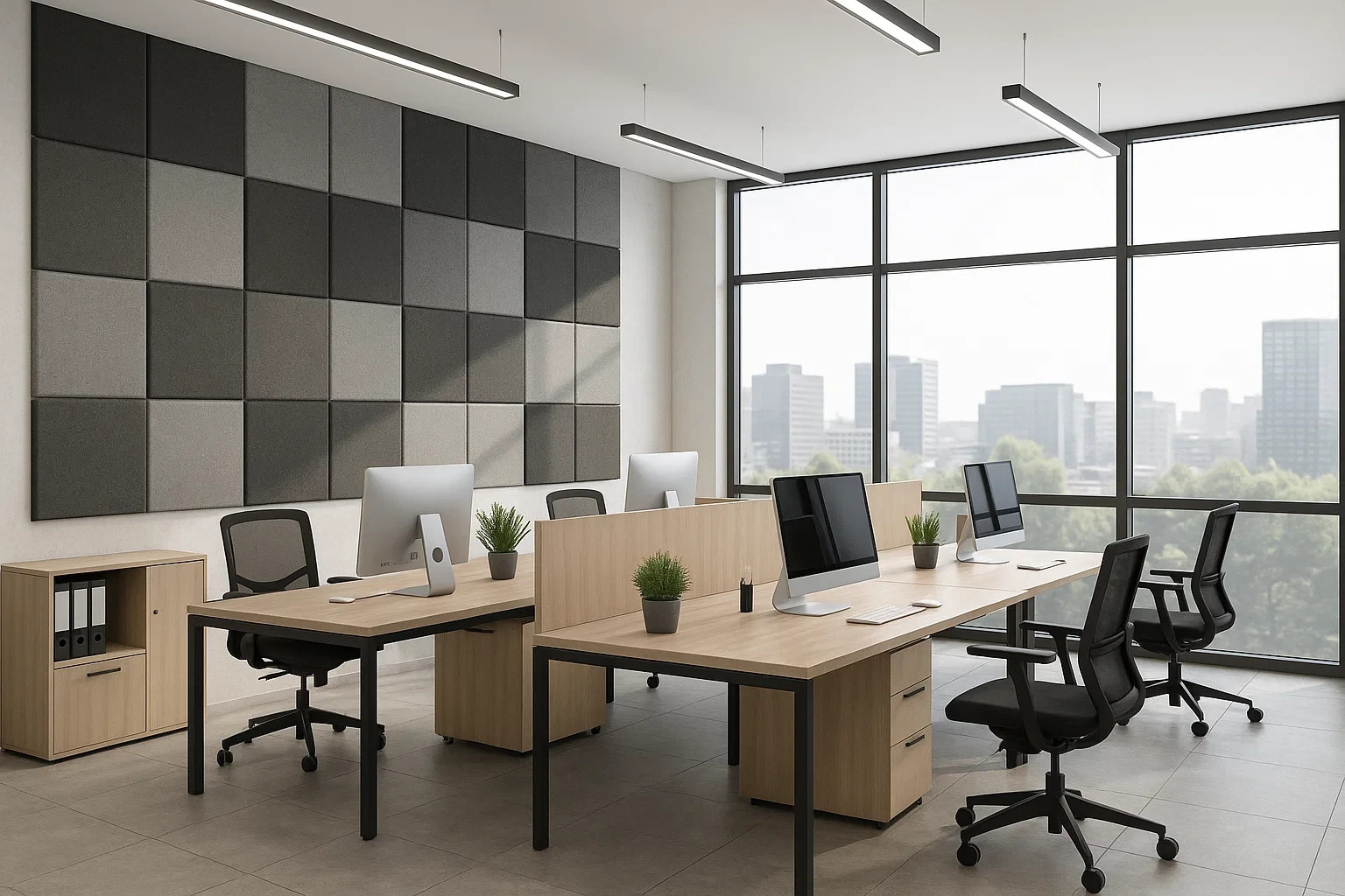 foto: Moderná kancelária s akustickými panelmi a podhľadmi pre lepšiu akustiku