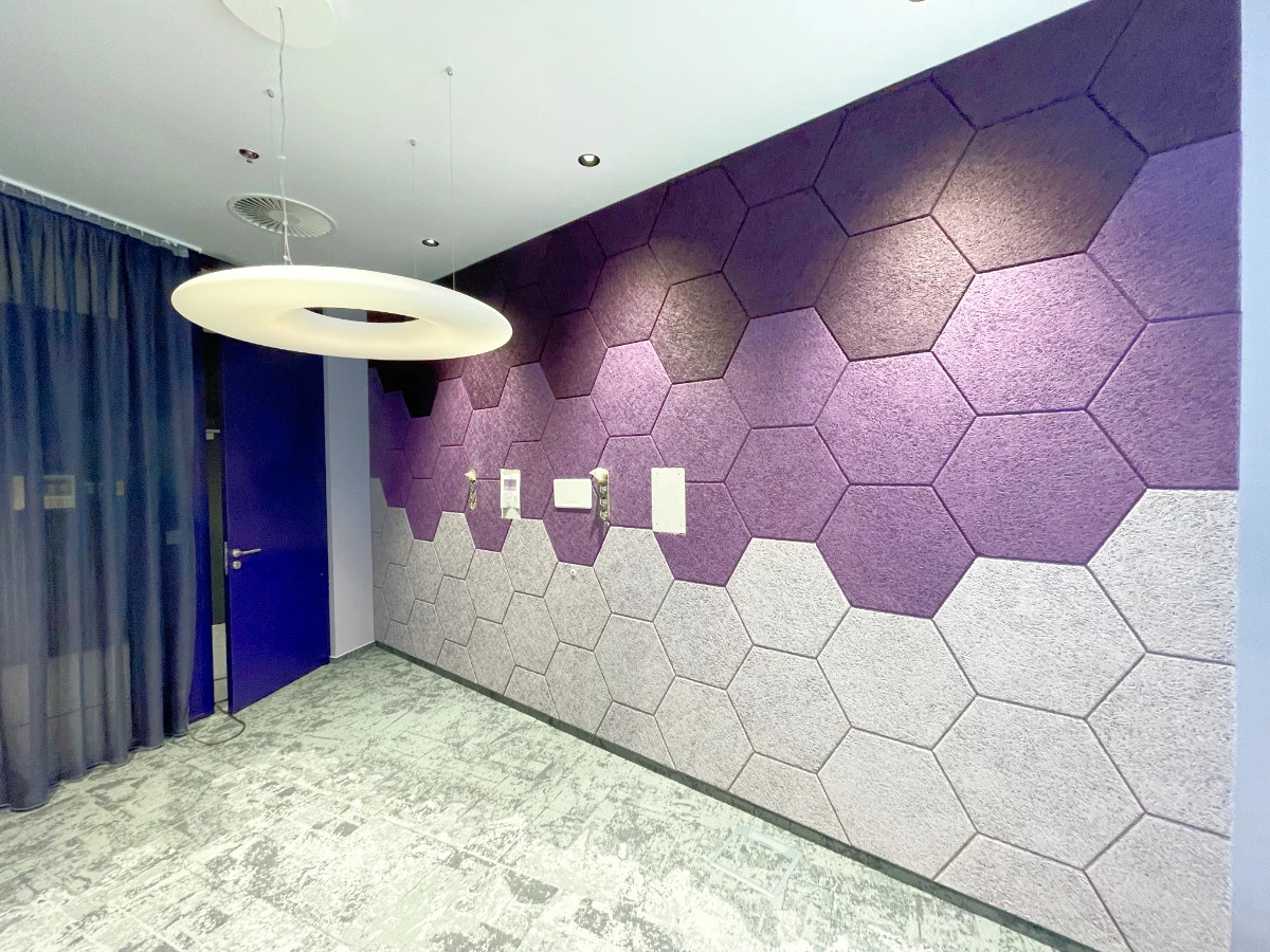 foto: Hotová zasadacia miestnosť s akustickými hexagonmi v odtieňoch fialovej a decentným ambientným osvetlením.