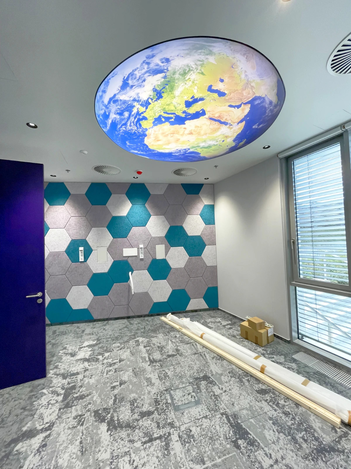 foto: Stena v kancelárii s motívom mesiaca a hexagóny v šedej a žltej kombinácii.