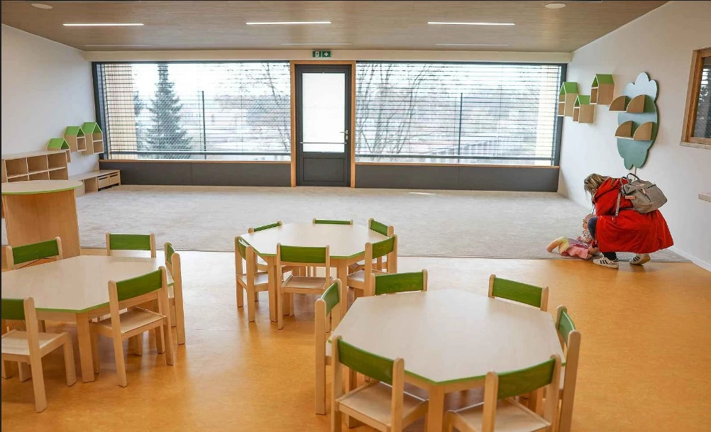 Interiér triedy s dôrazom na prirodzené materiály a akustický komfort – akustický strop ladí s dreveným nábytkom a zelenými akcentmi, ktoré vytvárajú príjemné a podnetné prostredie pre deti. Veľké okná zaisťujú dostatok denného svetla a vizuálny kontakt s vonkajším svetom.