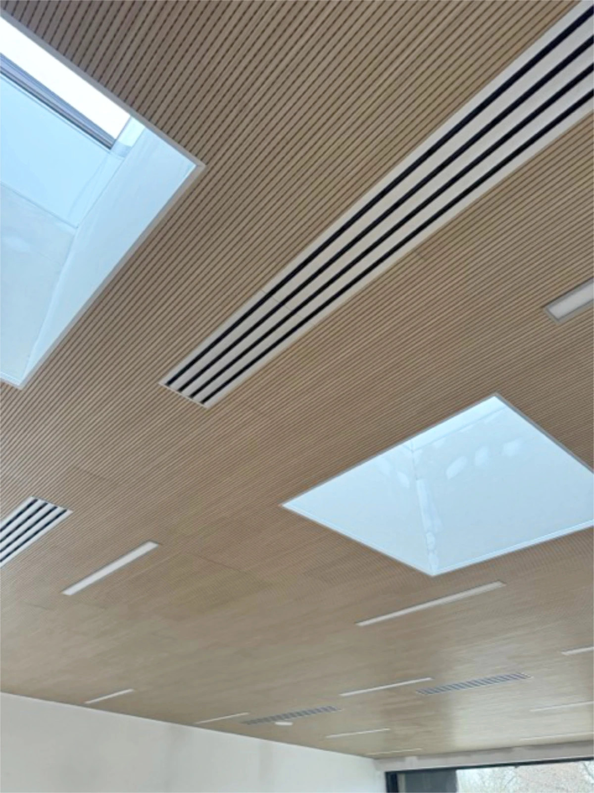 Drevený lamelový podhľad s precízne napojenými svetlíkmi, líniovým LED osvetlením a vetracími výustkami. Každý prvok bol integrovaný s ohľadom na akustické a požiarne požiadavky.