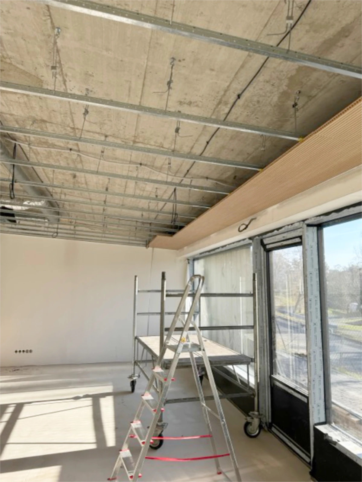 Montáž nosnej konštrukcie na podhľady počas výstavby. Dôraz na presnosť a technické riešenie detailov bol kľúčový pre bezchybné napojenie na ostatné stavebné prvky.