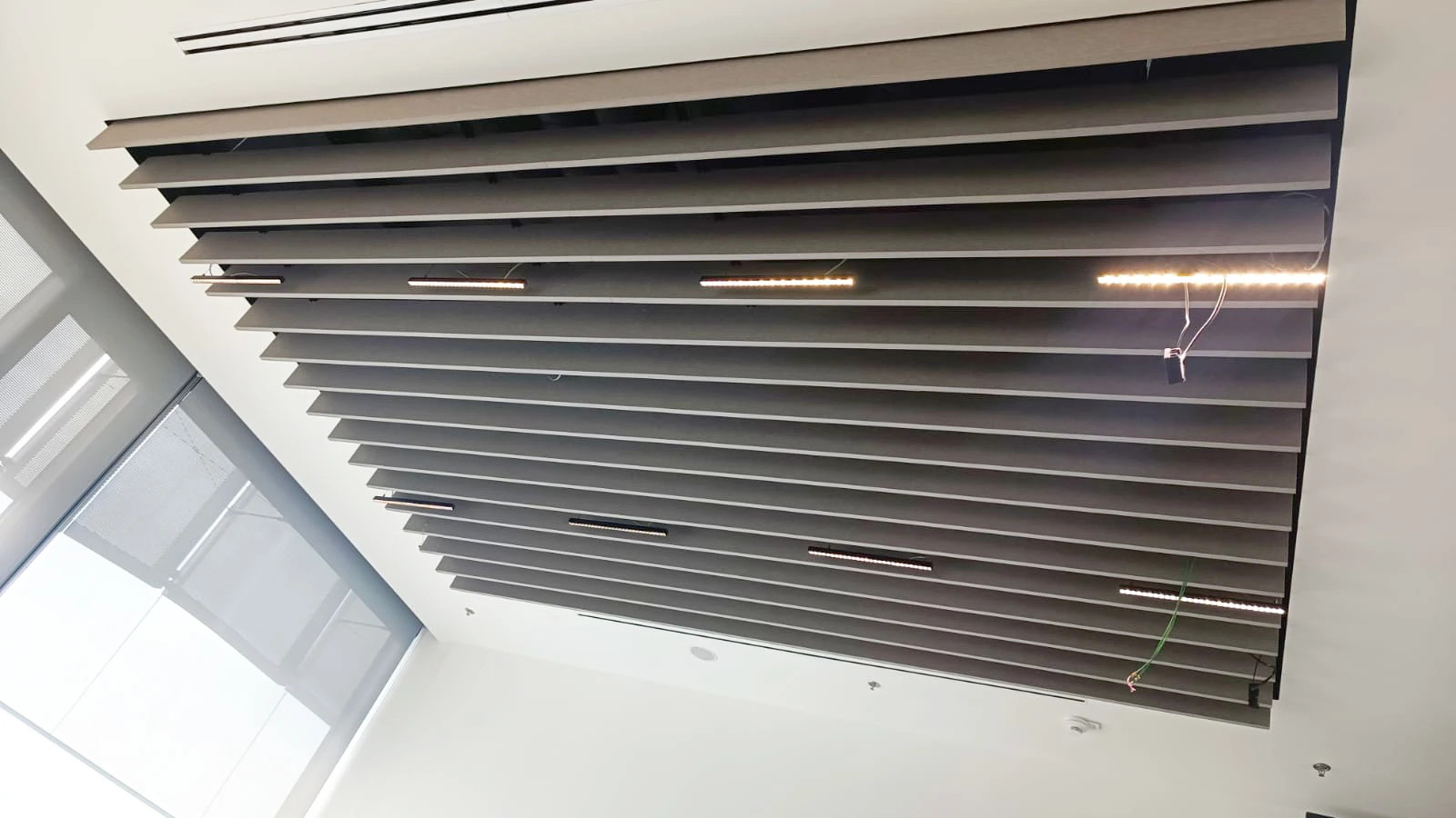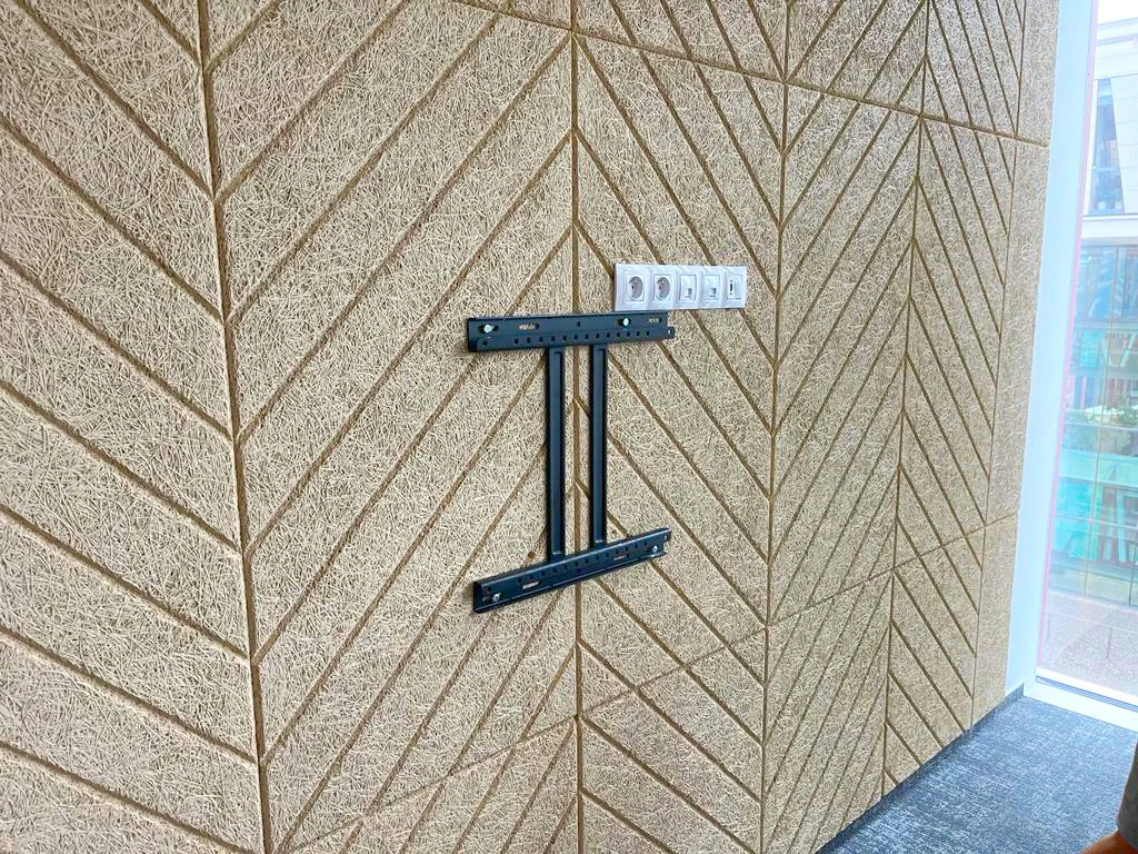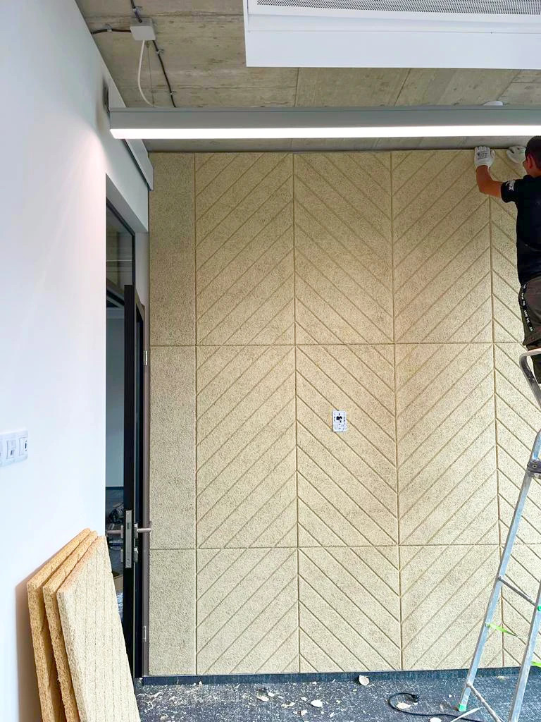 Výsledkom je stena, ktorá nielen tlmí zvuk a eliminuje ozvenu, ale zároveň pôsobí prirodzene a esteticky. Kombinácia prírodného tónu panelov, čiernych prvkov a presklených plôch vytvára harmonické pracovné prostredie.
