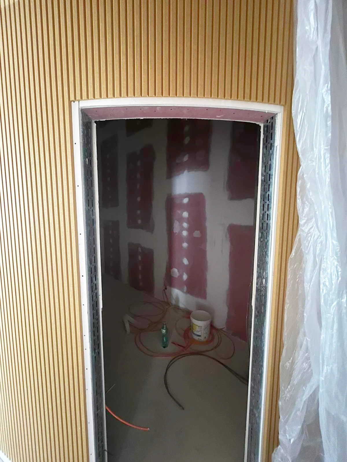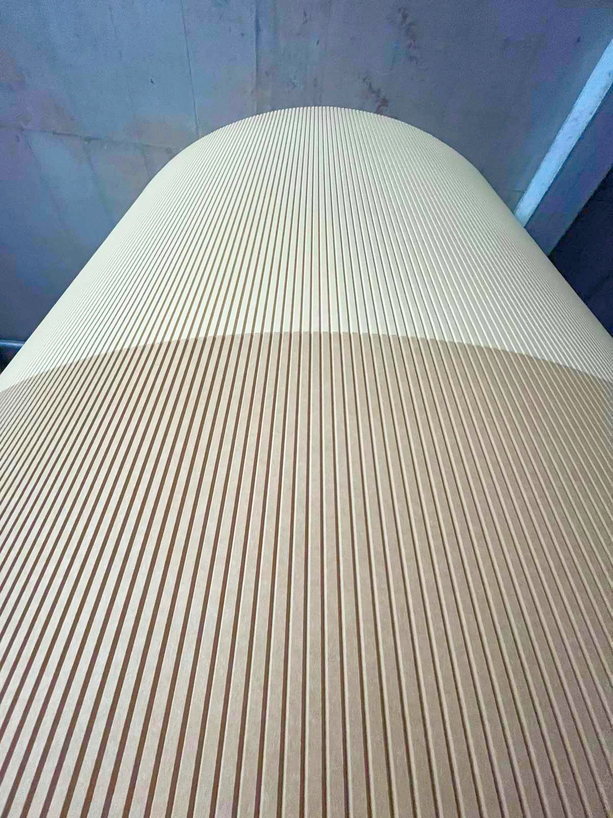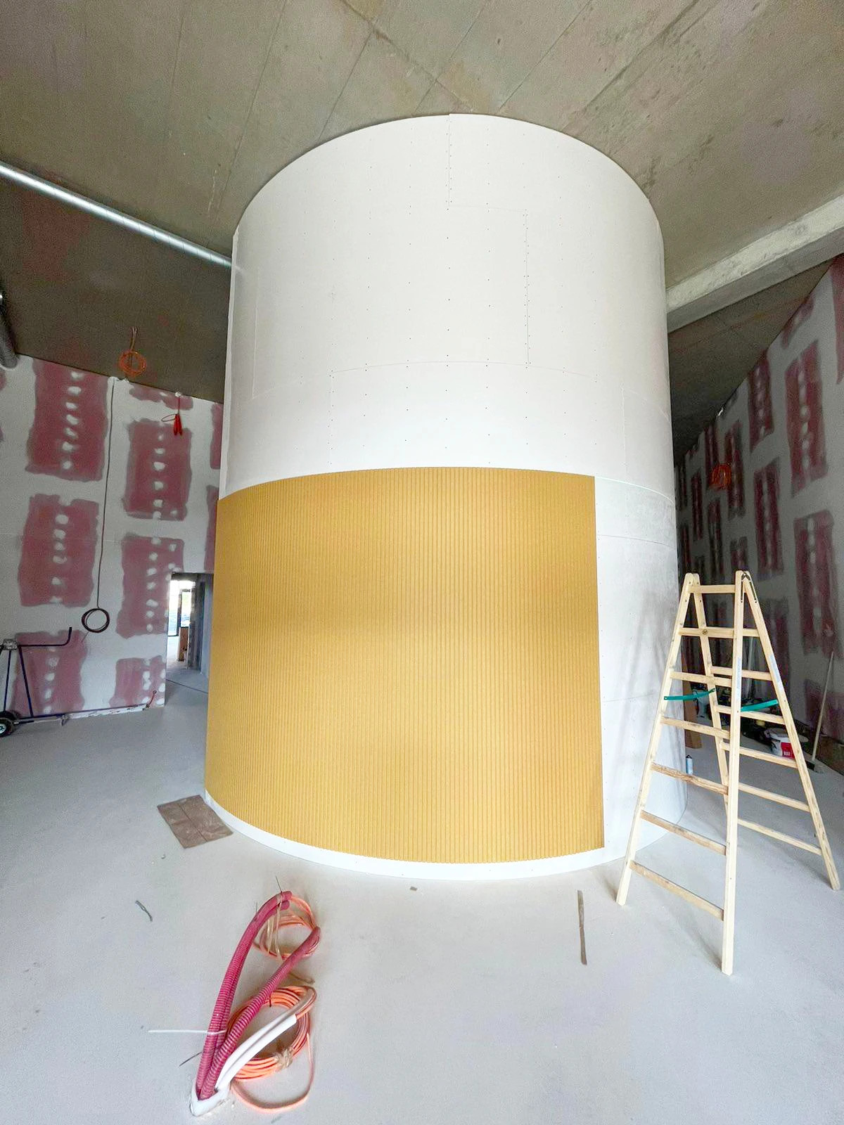 Ústredný tubusový stĺp v priestore škôlky pôvodne pôsobil skôr technicky, než hravo. Architekti však prišli s nápadom obložiť ho materiálom, ktorý by priniesol nielen vizuálnu zmenu, ale aj konkrétny úžitok – zníženie dozvuku a hluku. Vďaka nášmu riešeniu sa tento pôvodne nenápadný prvok premenil na prirodzenú dominantu priestoru.