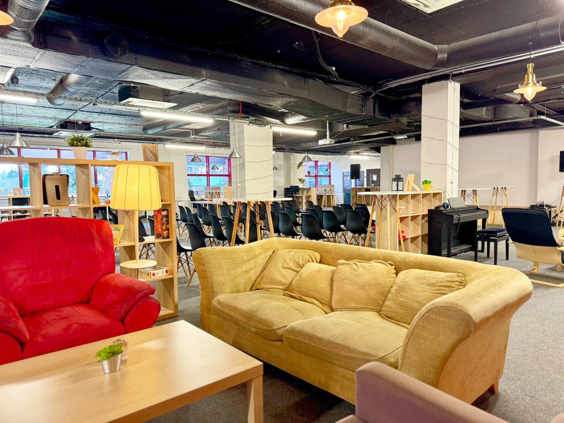 foto: Otvorený komunitný priestor s rôznorodým sedením a pódiom pre eventy, networking alebo neformálne stretnutie.