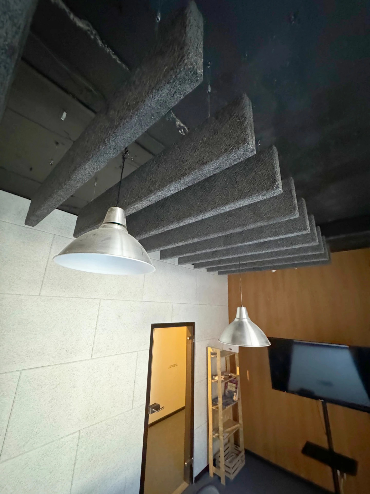 foto: Zasadacia miestnosť vybavená závesnými akustickými prvkami na tlmenie odrazov zvuku v industriálnom interiéri.