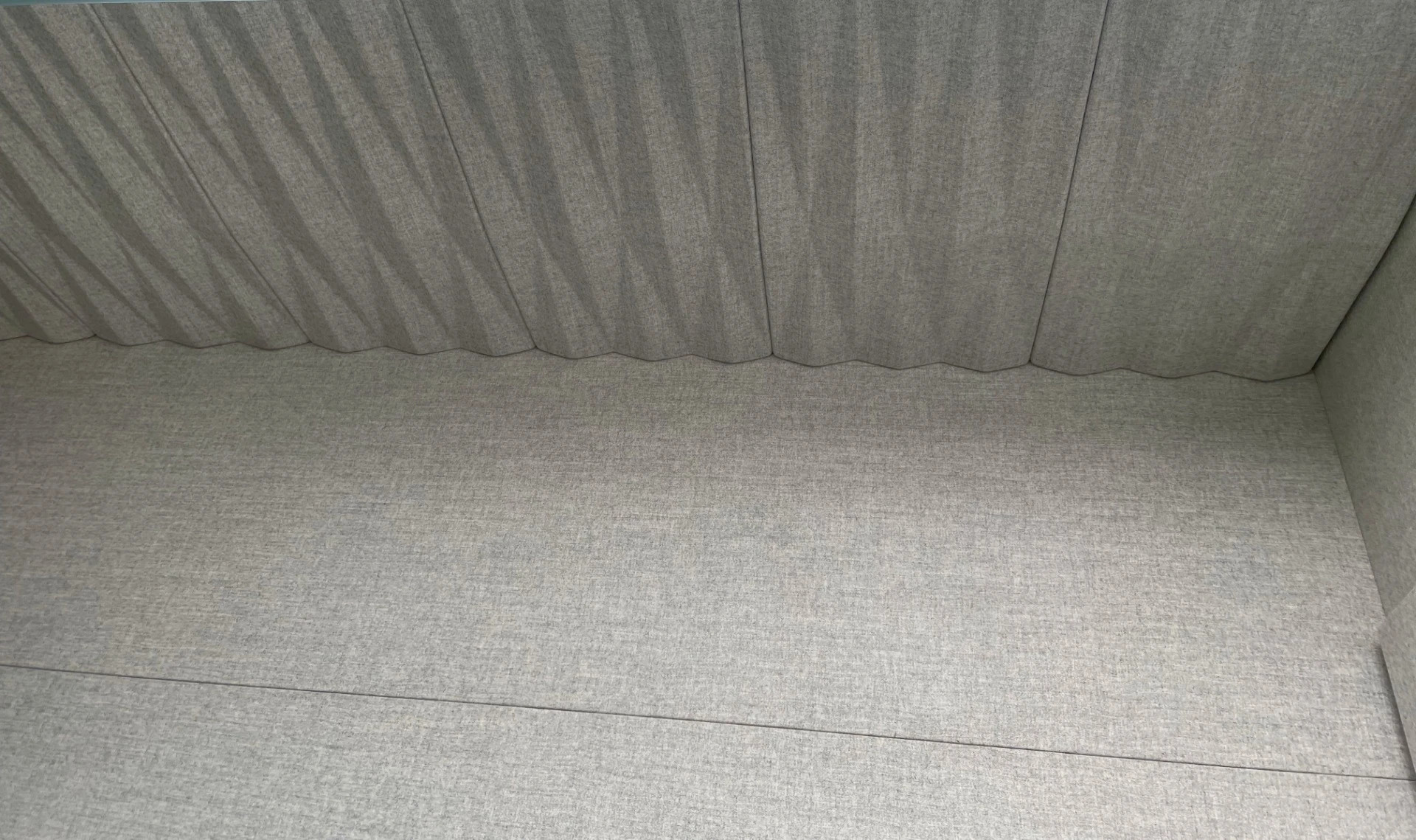 VANK box je vybavený obojstranným čalúnením s vlnitým profilom, ktoré významne pohlcuje hluk. Vďaka tomu ponúka používateľom pokojné prostredie, v ktorom sa môžu sústrediť alebo bez rušenia telefonovať – a to aj v priestoroch s vysokou hlučnosťou. Vnútorné panely aj strop sú potiahnuté akustickým materiálom v príjemnom šedom tóne.