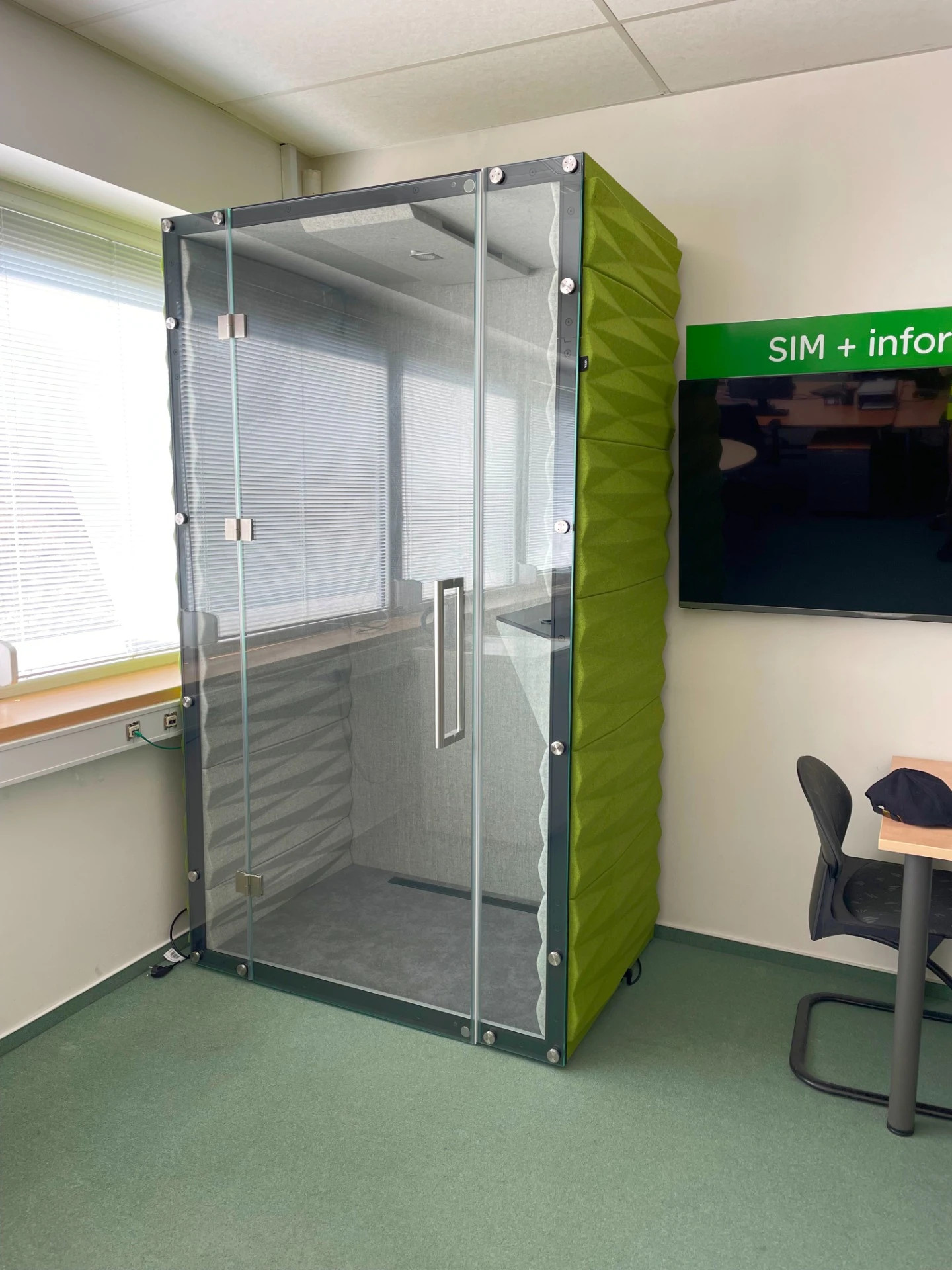 foto: Kompletne nainštalovaný VANK box vo výrobnej kancelárii firmy Schindler. Elegantná kombinácia skla a akustických panelov v šedej a zelenej.