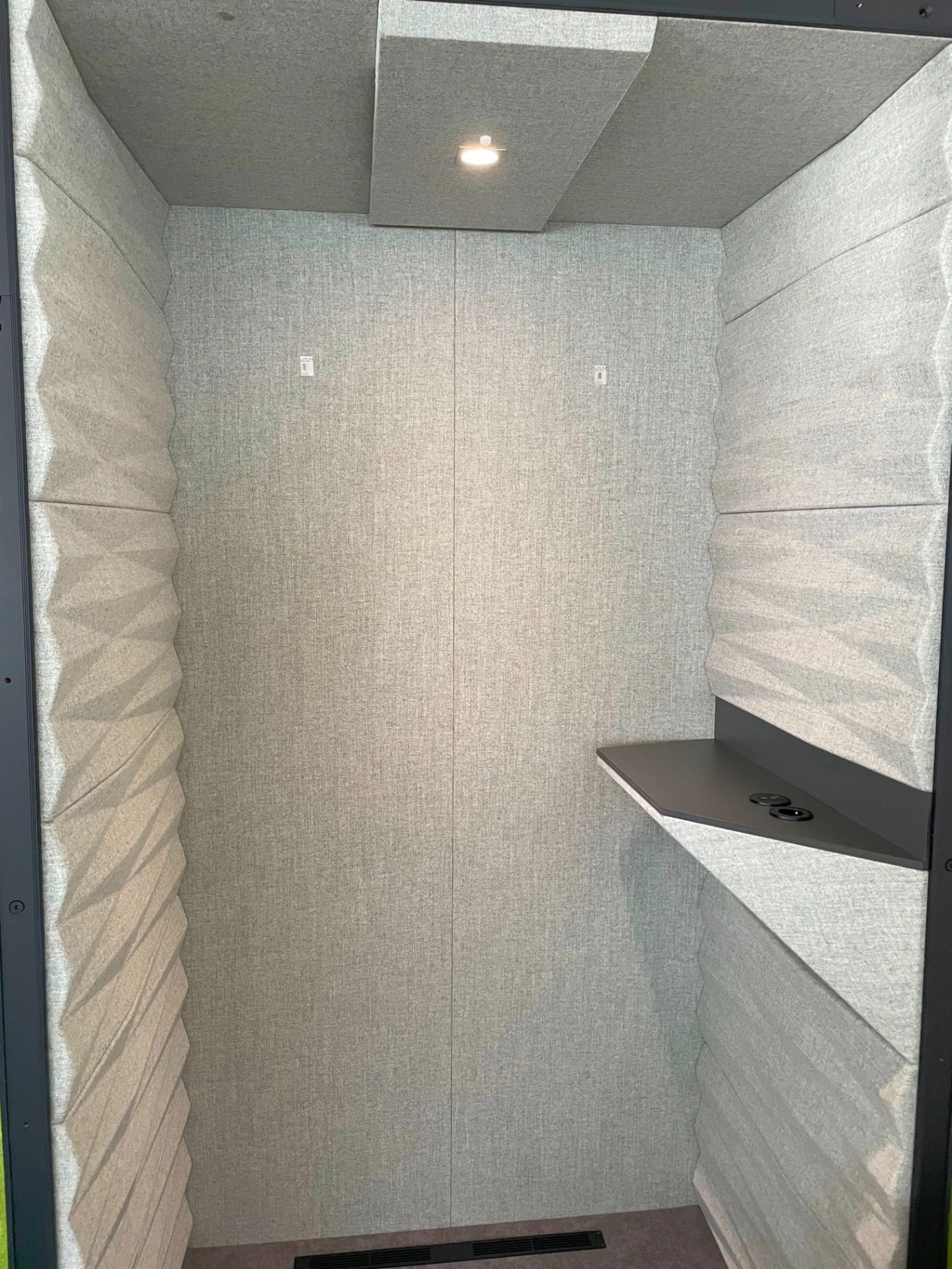 foto: Pohľad do interiéru boxu. Vlnité akustické panely, pracovný stolík a dostatok priestoru na sedenie aj prácu v stoji.