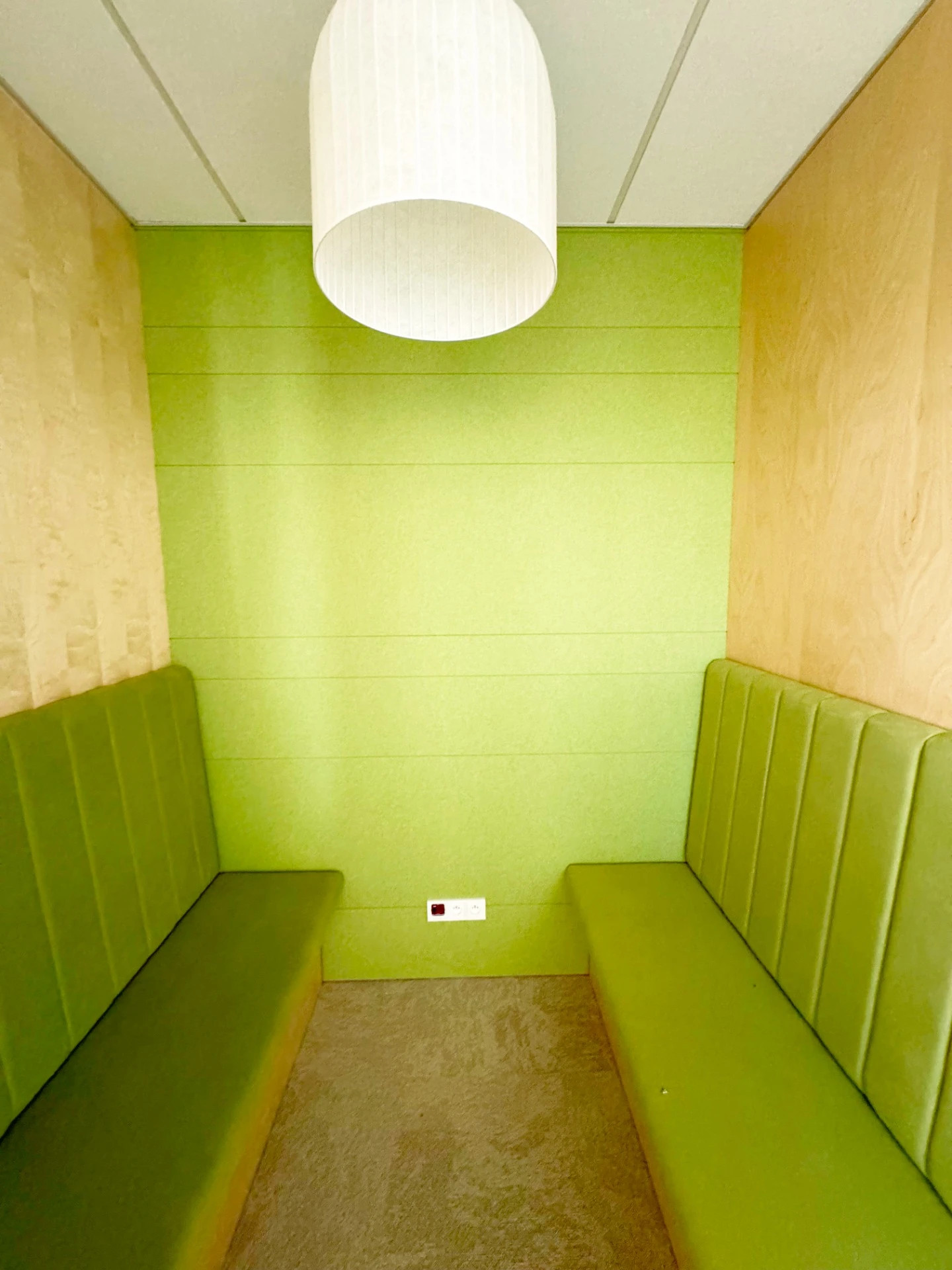 foto: Akustická nika s mäkkým obkladom v prírodnej a zelenej kombinácii ponúka pokojné miesto na sústredenie či krátke jednanie.