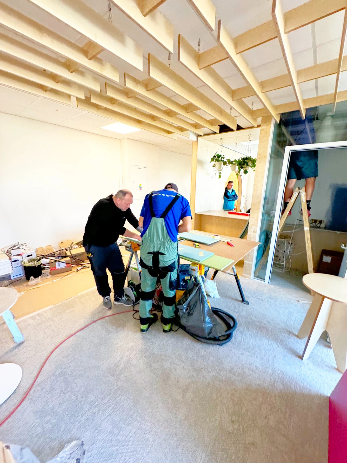 foto: Inštalácia akustických lamiel v stropnej časti – presné zameranie a remeselná príprava sú kľúčom k bezchybnej montáži.